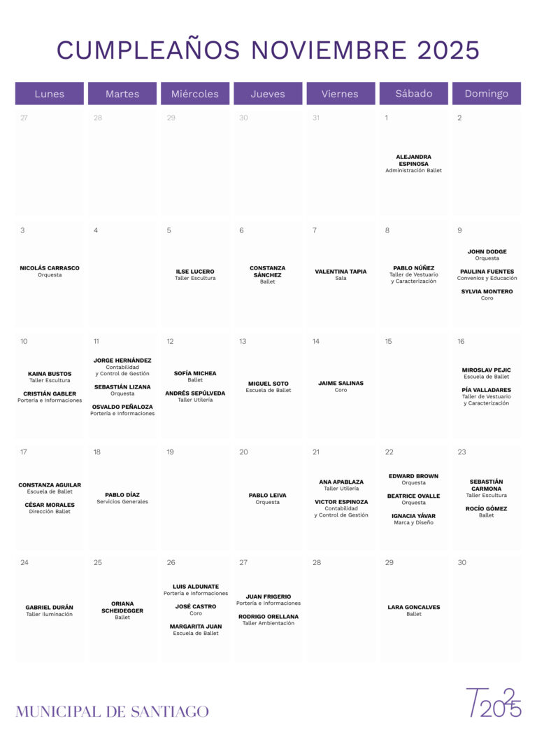 Estimados(as) trabajadores(as): Junto con saludarles, informamos que el Teatro Municipal de Santiago, dispone de la siguiente planificación para la autorización