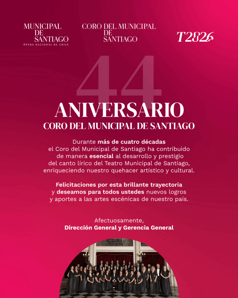 Durante más de cuatro décadas el Coro del Municipal de Santiago ha contribuido de manera esencial al desarrollo y prestigio del canto lírico del Teatro Municipal de Santiago, enriqueciendo nuestro quehacer artístico y cultural.
